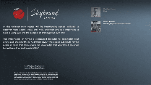 In this webinar Matt Pearce will be interviewing Denise Williams to discover more about Trusts and Wills. Discover why it is important to have a Living Will and the dangers of drafting your own Will.